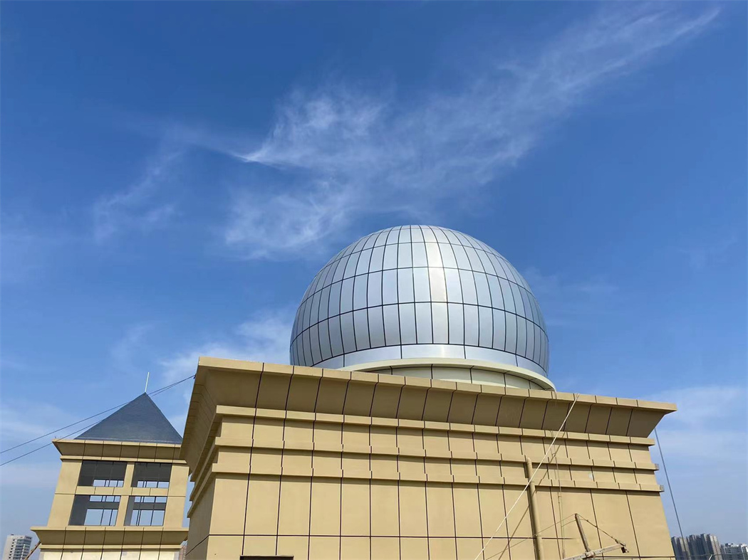淮北中學(xué)天文臺,在樓頂搭建一座2.5米高房子,雙層結(jié)構(gòu),外板采用鋁塑板,內(nèi)板采用微孔鋁板,中間有吸音棉,一樓鋪設(shè)地磚,二樓鋼結(jié)構(gòu),鋼平臺大梁小梁采用矩形管,定制望遠鏡基座,用于后期放置望遠鏡用,制作順墻弧形鋼梯,扶手采用市場專用扶手,美觀、牢固。上層配備9米經(jīng)典式天文圓頂,外殼光滑,具備抗腐蝕,防銹,密封防塵好,不漏雨,也是天文觀測的標志性建筑,經(jīng)典型天文圓頂古典美麗,是大眾認知度很高的一種天文建筑。