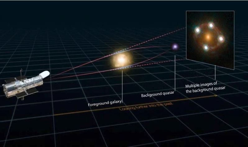 遙遠(yuǎn)類星體發(fā)出的光,在經(jīng)過前方星系的引力勢阱的時(shí)候發(fā)生了彎曲,所以光在到達(dá)望遠(yuǎn)鏡的時(shí)候所看到的圖片會(huì)像最右邊圖像所顯示的那樣。(圖源:Martin Millon/Swiss Federal Institute of Technology Lausanne;Hubble Space Telescope/NASA)